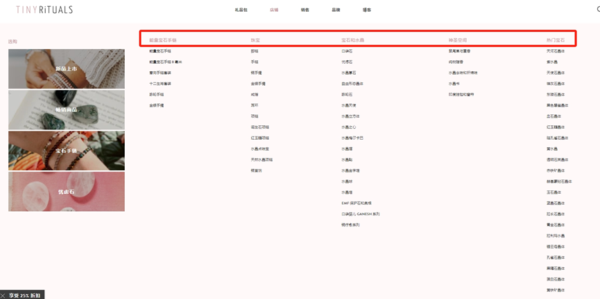 事实上,已经有不少小众类目的卖家依靠独立站崭露头角了,像水晶珠宝品牌TINY RITUALS就是其中一员。该品牌独立站美观大方,为消费者提供了高达16种类型的水晶选择,制品包括手链、耳环、项链等。凭借着用心的设计和精准营销,TINY RITUALS热度高涨,独立站流量在送礼高峰期时甚至能达到近百万。
