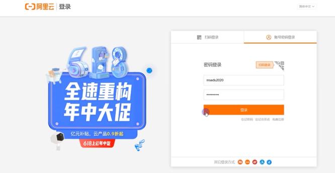 如果之前有注册账号直接登录,如果新会员请点击"免费注册",免费注册可以是公司的也可以是个人的,免费注册后请进行实名认证,这里假设已经注册了阿里云账号,输入账号密码,点击登录。
