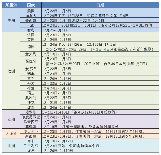 不同类型的新年邮件,最佳发送时间也不同,比如祝福类邮件通常新年前一周发送比较好。当然也可以按照客户具体放假时间来确定发送时间,因为有些国家的放假并不一致,所以要提前确定好客户放假的时间安排,不然发早了就效果不大,发晚了又错失良机。因为很多国家圣诞节跟元旦新年一起放假,所以下面整理部分国家圣诞节至新年放假时间,大家可以参考一下: